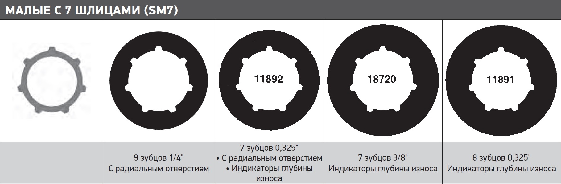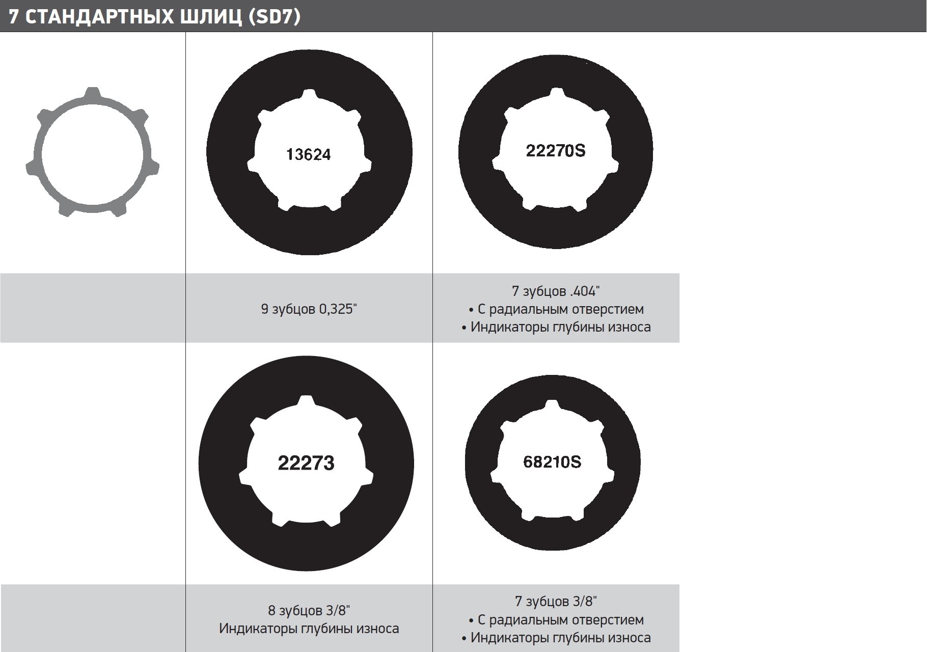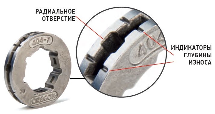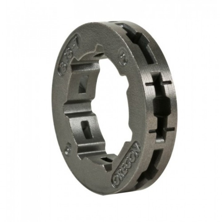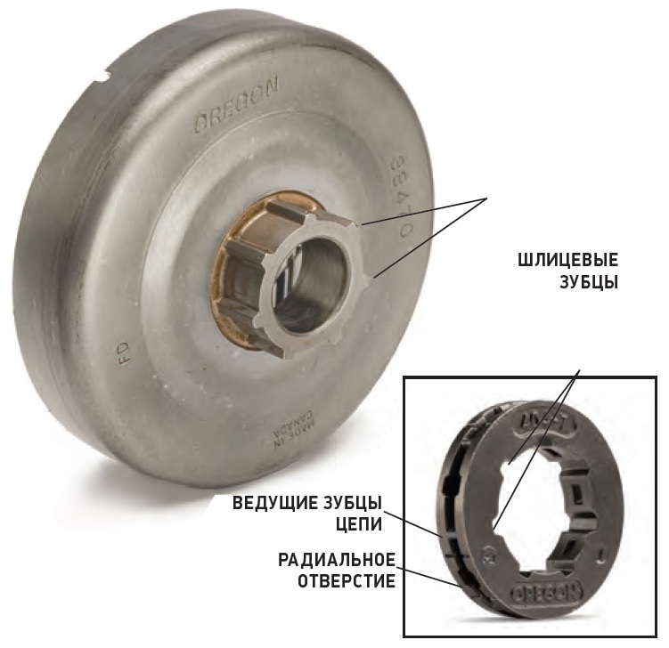 Слід знати, що зубці шліців (які утримують зубчастий вінець на штатному місці) відрізняються від зубів навколо зовнішньої кромки зубчастого вінця (який приводить в рух ланцюг). Деякі зубчасті вінці Oregon® мають сім зубців на шліцах і сім зубів на зовнішній кромці зубчастого вінця. Будьте уважні, не переплутайте число зубців на шліцах в центрі зубчастого вінця з числом зубів приводу ланцюга, розташованих на зовнішній кромці зубчастого вінця